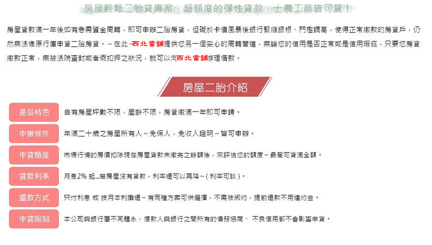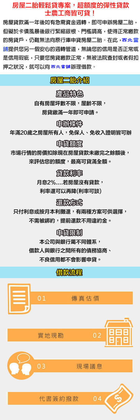 談一下台北市二胎房貸,民間俗稱「台北市房屋二胎」,這類台北市二順位房貸,主要以台北市房地不動產抵押,運用銀行、民間房屋貸款..等合法融資......
